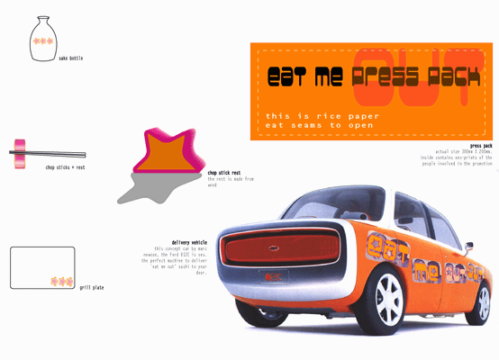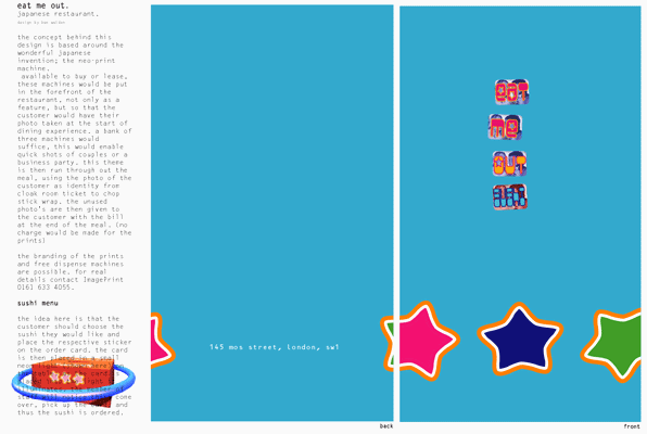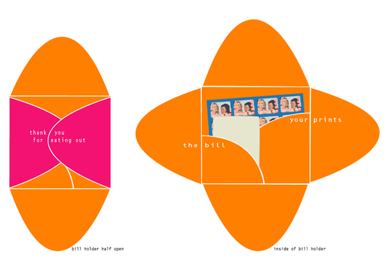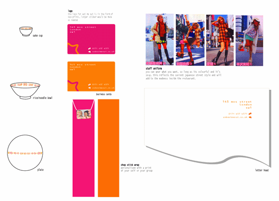 the concept behind this design is based around the wonderful japanese invention; the neo-print machine. available to buy or lease, these machines would be put in the forefront of the restaurant, not only as a feature, but so that the customer would have their photo taken at the start of dining experience. a bank of three machines would suffice, this would enable quick shots of couples or a business party. this theme is then run through out the meal, using the photo of the customer as identity from cloak room ticket to chop stick wrap. the unused photo's are then given to the customer with the bill at the end of the meal. (no charge would be made for the prints) the branding of the prints and free dispense machines are possible. for real details contact ImagePrint 0161 633 4055.