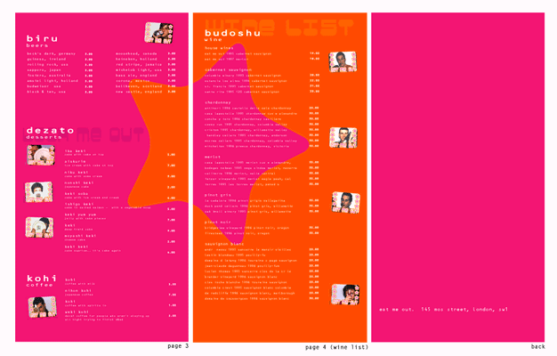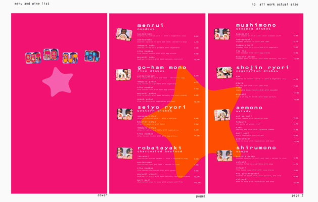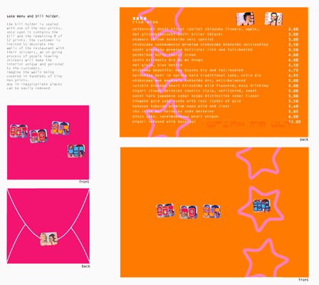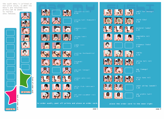 sushi menu the idea here is that the customer should choose the sushi they would like and place the respective sticker on the order card. the card is then placed in a small neon light on the table. as the card is placed into the light it illuminates. the member of staff will notice this, come over, pick up the card, and thus the sushi is ordered. the sushi menu is printed on non-stick stock, so when the menu's are returned more prints can be added to replace ones removed.