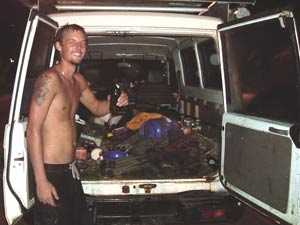 4 of us hanging to go fishing but due to a seppo navy destroyer being moored on the jetty, catching barra was off cards. up turns the roach eating barnaby heir to british millions, a genius half wit drunk - anything for fishing. it's late but the thought of adventures gets me out of my seat and into barnabys land cruisers. 5 mins of filling a radiator, it was still empty and we left.